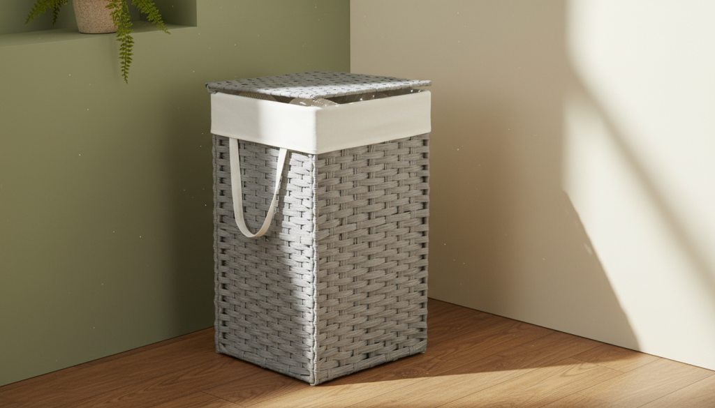 This is the “looks nice in the room” option that still functions well. Rattan-style (synthetic) often has built-in airflow, which helps with odor. The lid keeps visuals clean, and a removable liner makes it easy to keep fresh.
